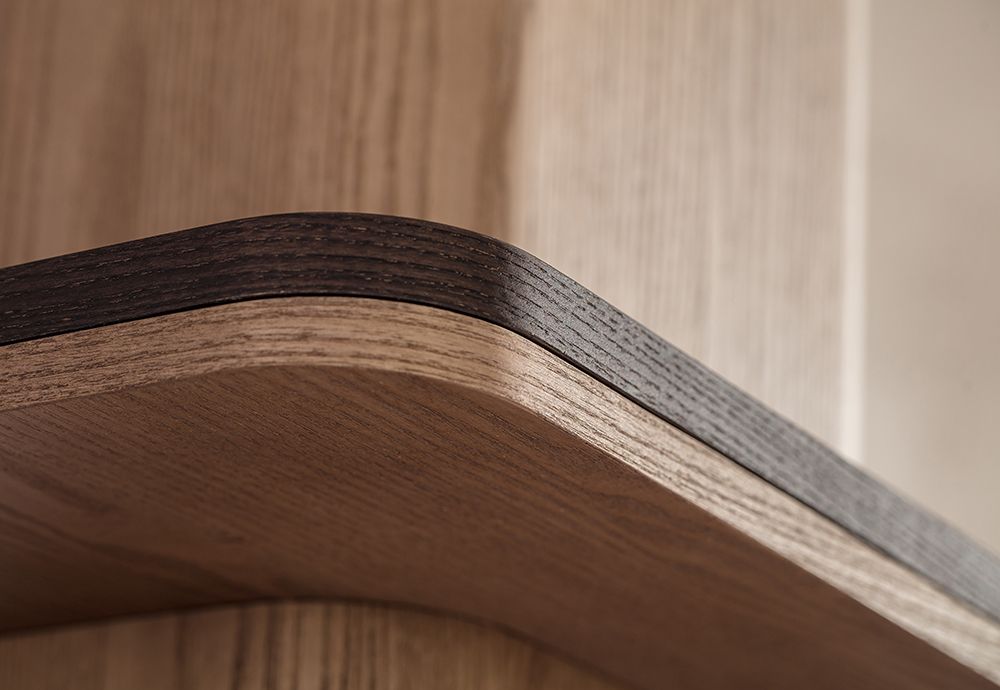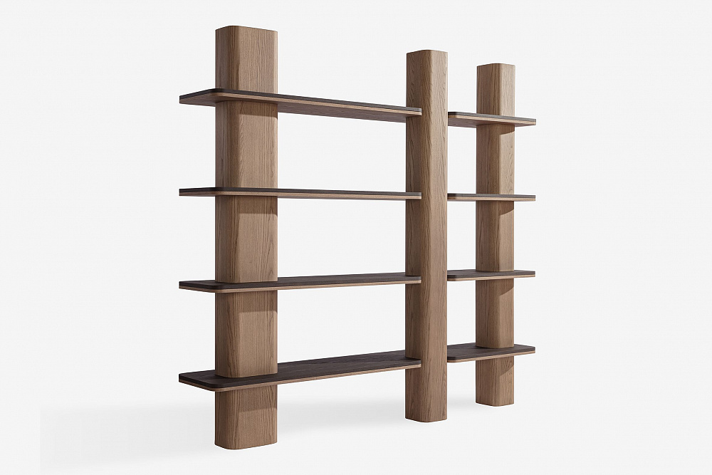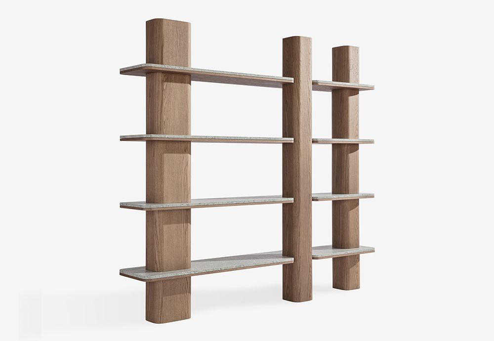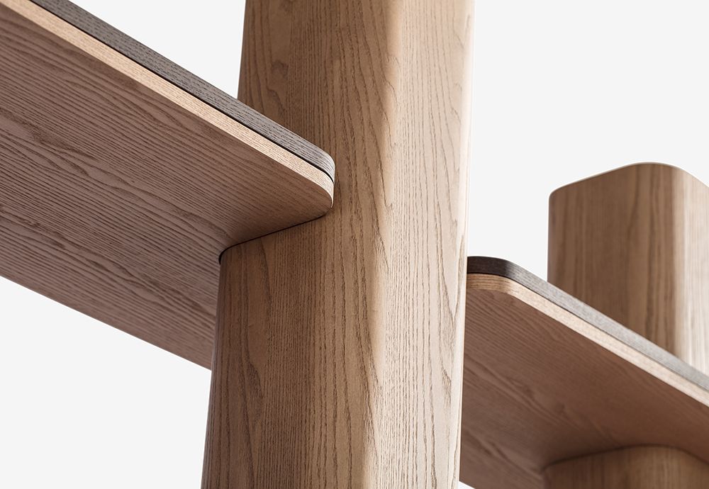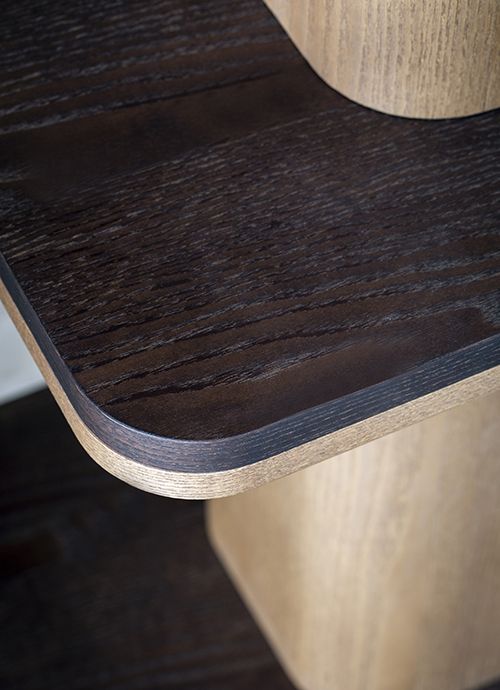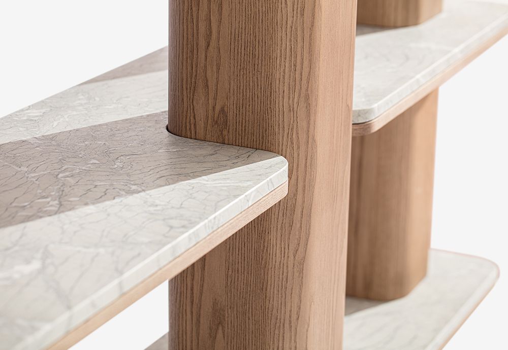 Книжный шкаф из древесноволокнистых панелей, облицованных шпоном ясеня. / Полки доступны из дерева или мрамора толщиной 20 мм, столешницы из ясеня.