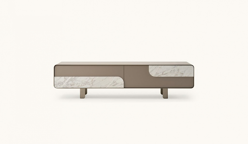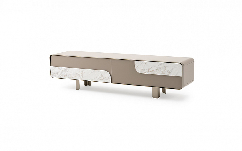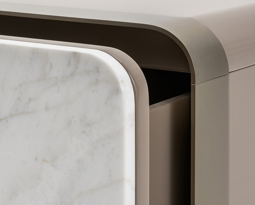 Структура : МДФ, древесно-стружечная плита с одноцветным глянцевым полиэстеровым лаковым покрытием или отделкой под орех. / Ящики : два ящика доступны в трех вариантах: с деталями из орехового дерева, с деталями из мрамора, с деталями из кожи. / Детали и ножки : металлическая отделка матово-темная платина или матово-светлая платина.