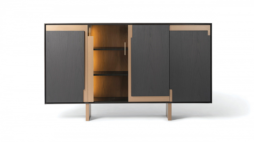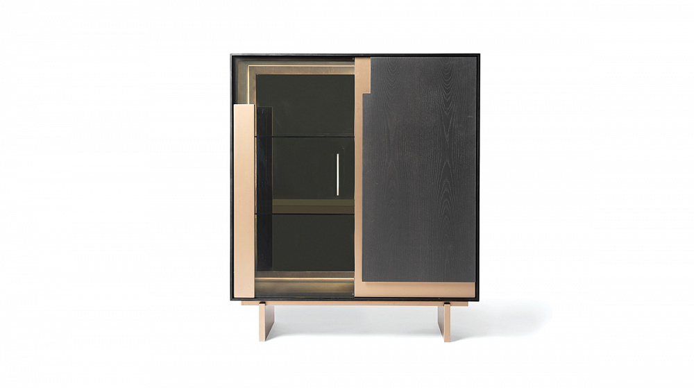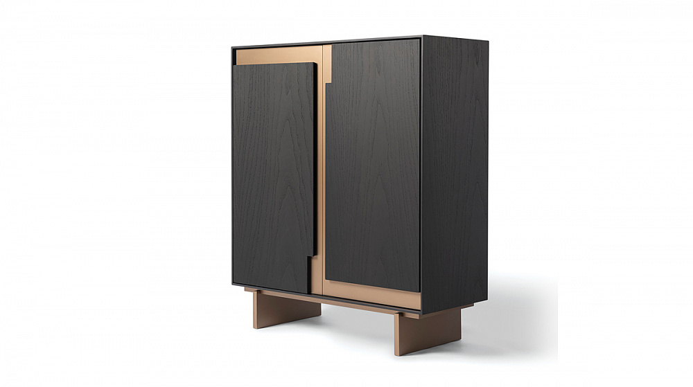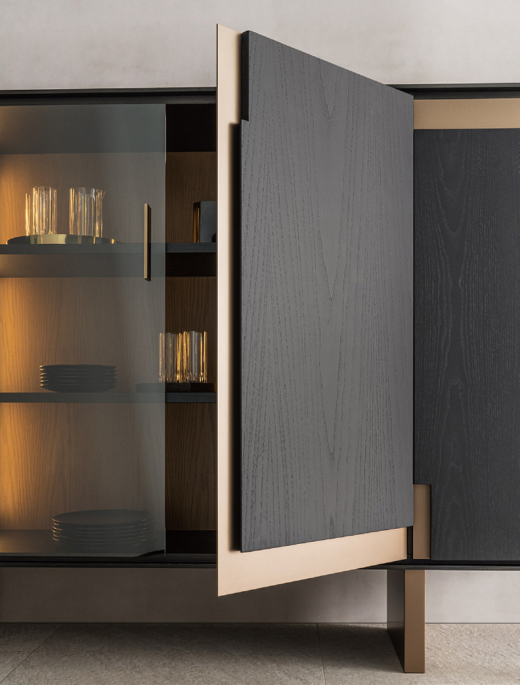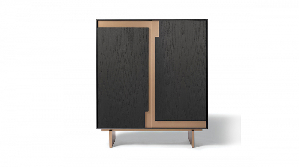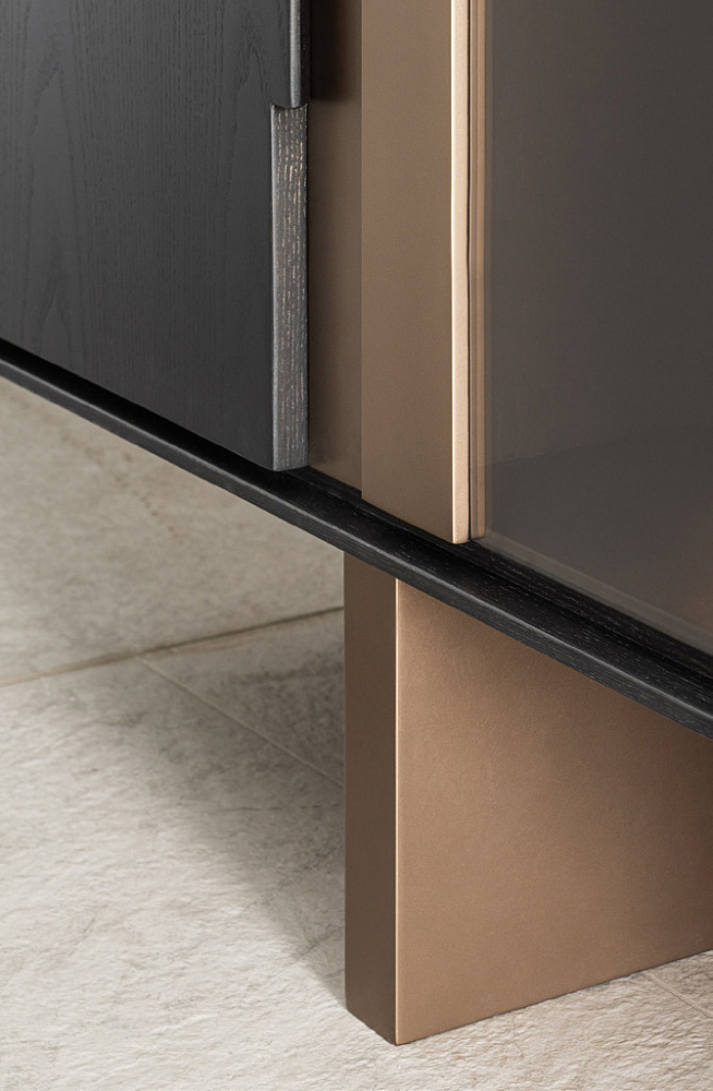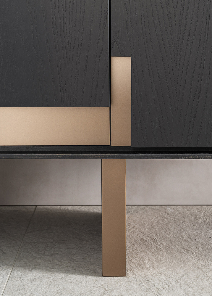 Шкаф с деревянной рамой / распашные деревянные двери со светло-бронзовыми металлическими вставками / светло-бронзовые деревянные ножки / деревянные полки