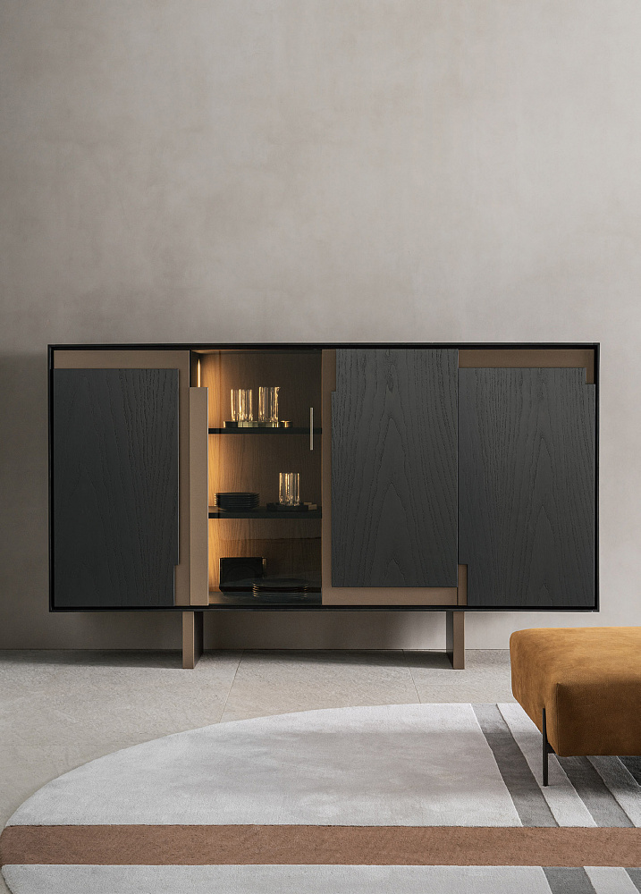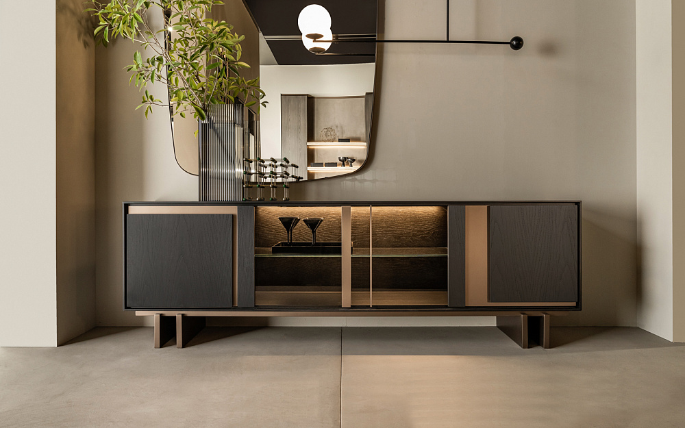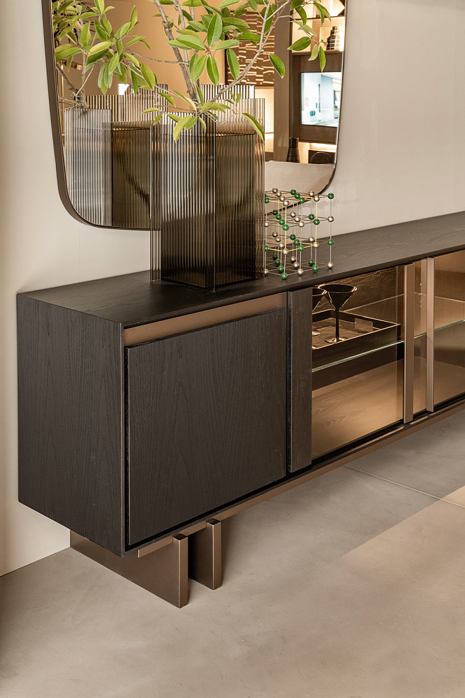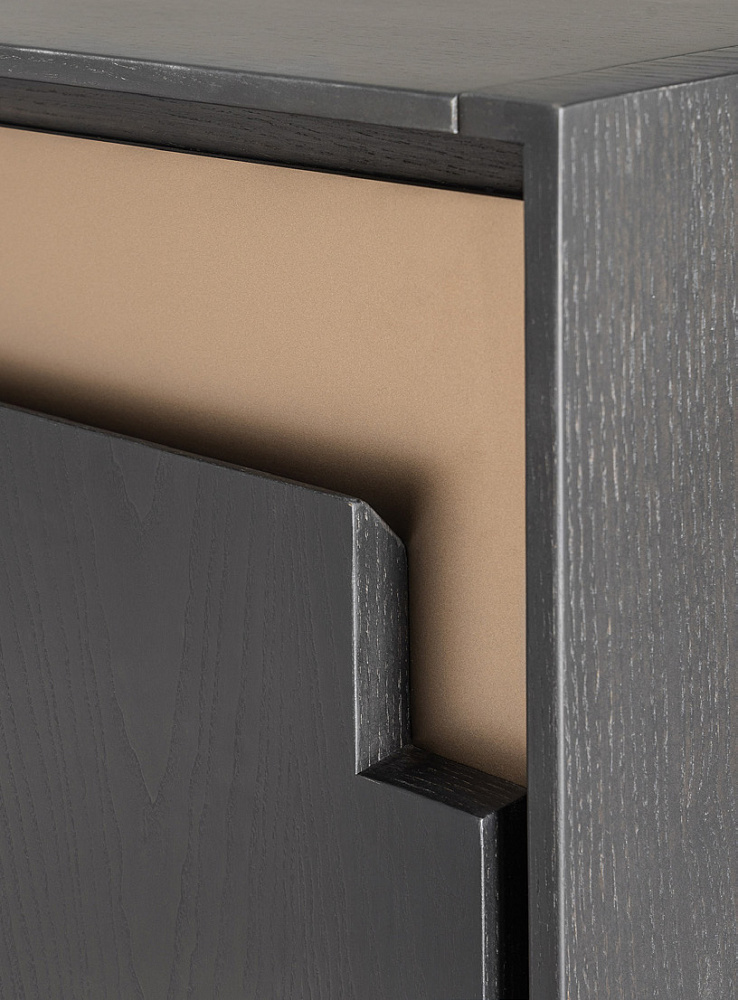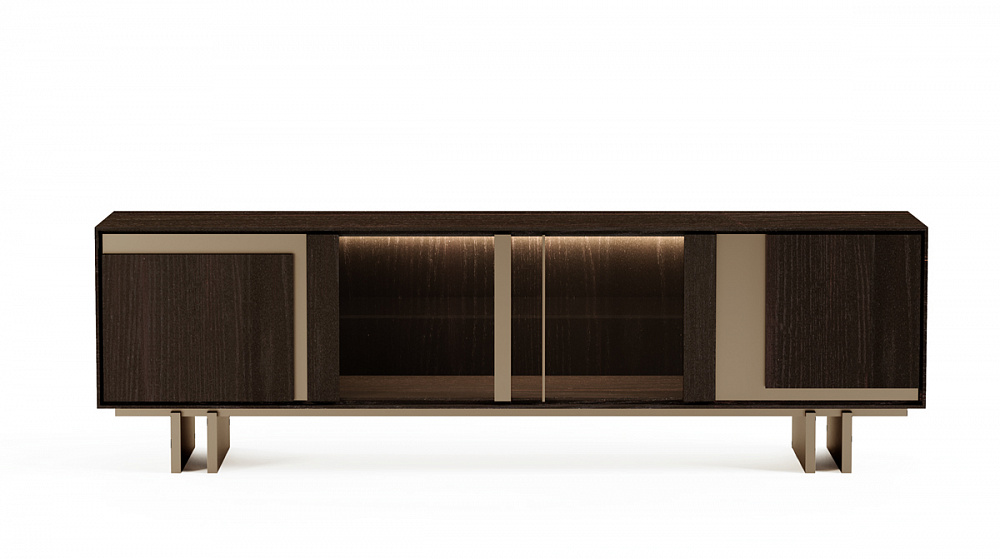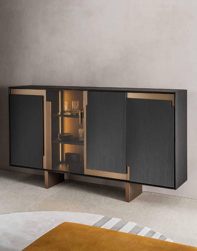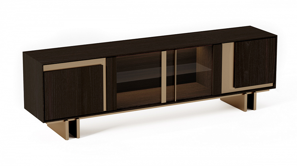 Шкаф с деревянной рамой / распашные деревянные двери со светло-бронзовыми металлическими вставками / светло-бронзовые деревянные ножки / деревянные полки