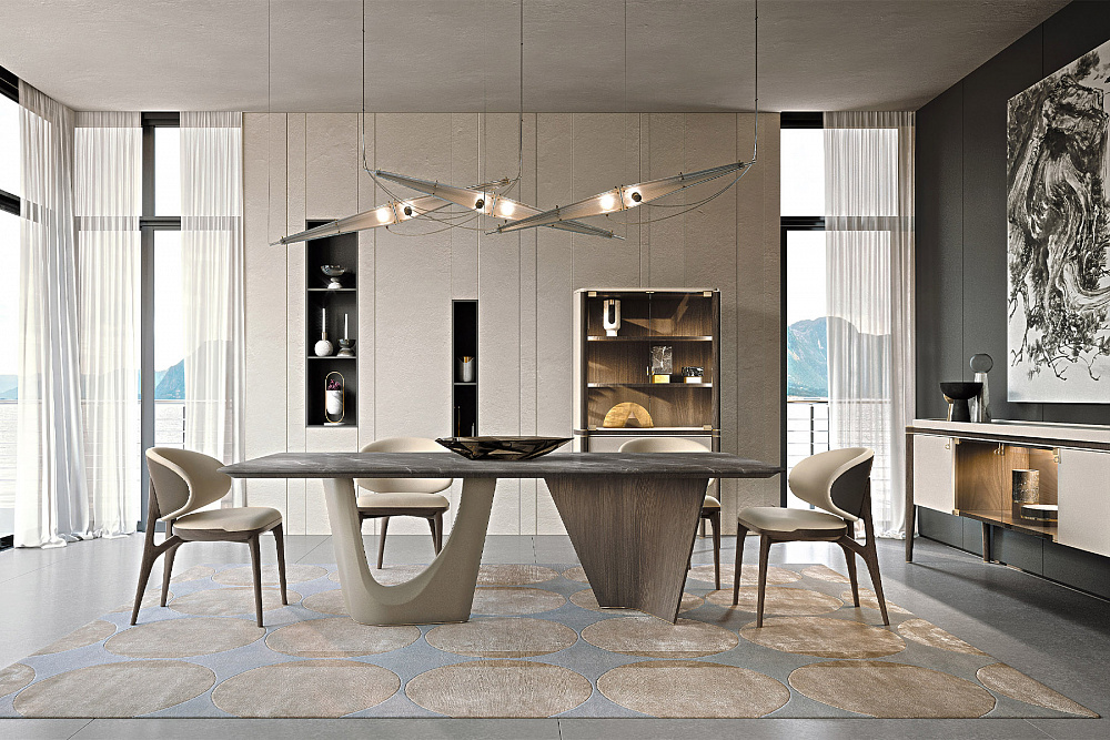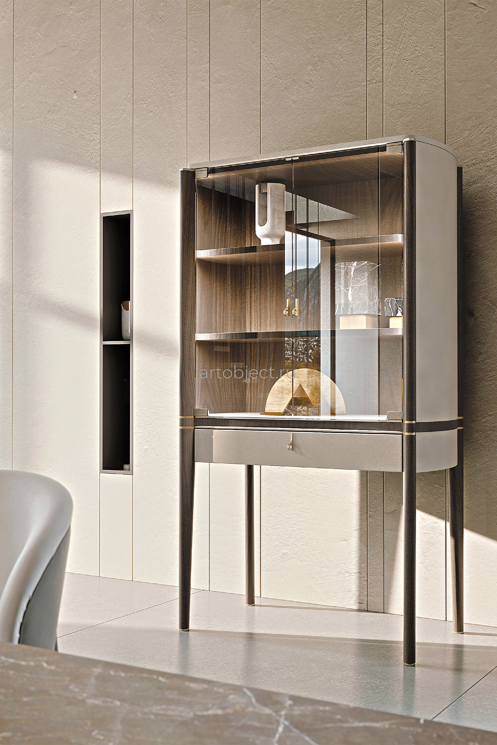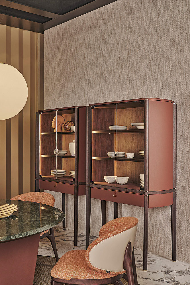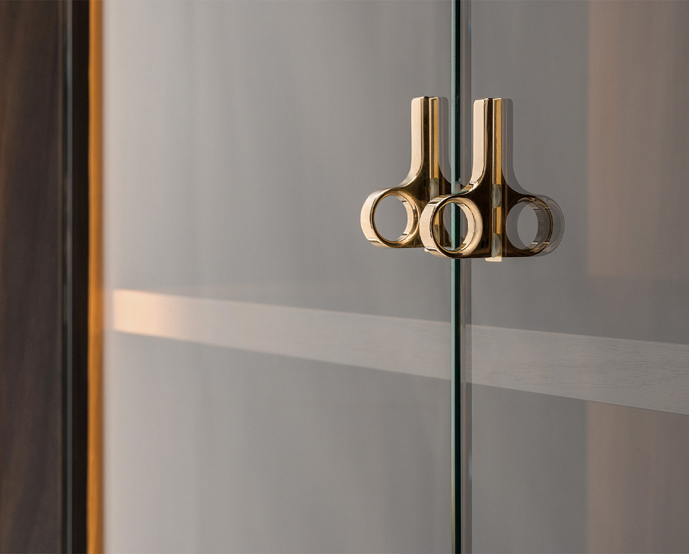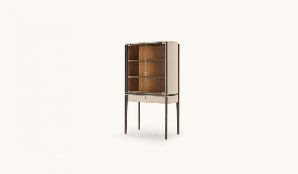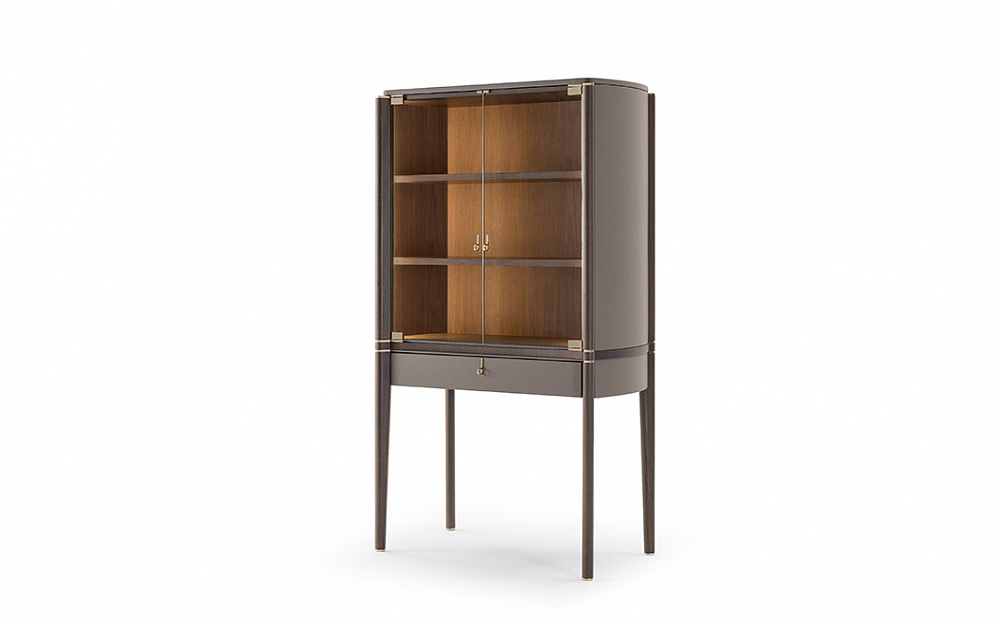 Структура : МДФ, массив ореха, ДСП со шпоном и фанера. Кожаные аппликации. / Внутренняя часть с дверцами : стеклянные дверцы. Полки из орехового шпона. Светодиодная боковая подсветка. / Ящик : один с лицевой стороной, обтянутой кожей, и внутренней частью, отделанной шпоном ореха. Кожаный коврик у основания ящика. / Детали, ручки и ножки : металлическая отделка светло-золотистого цвета.