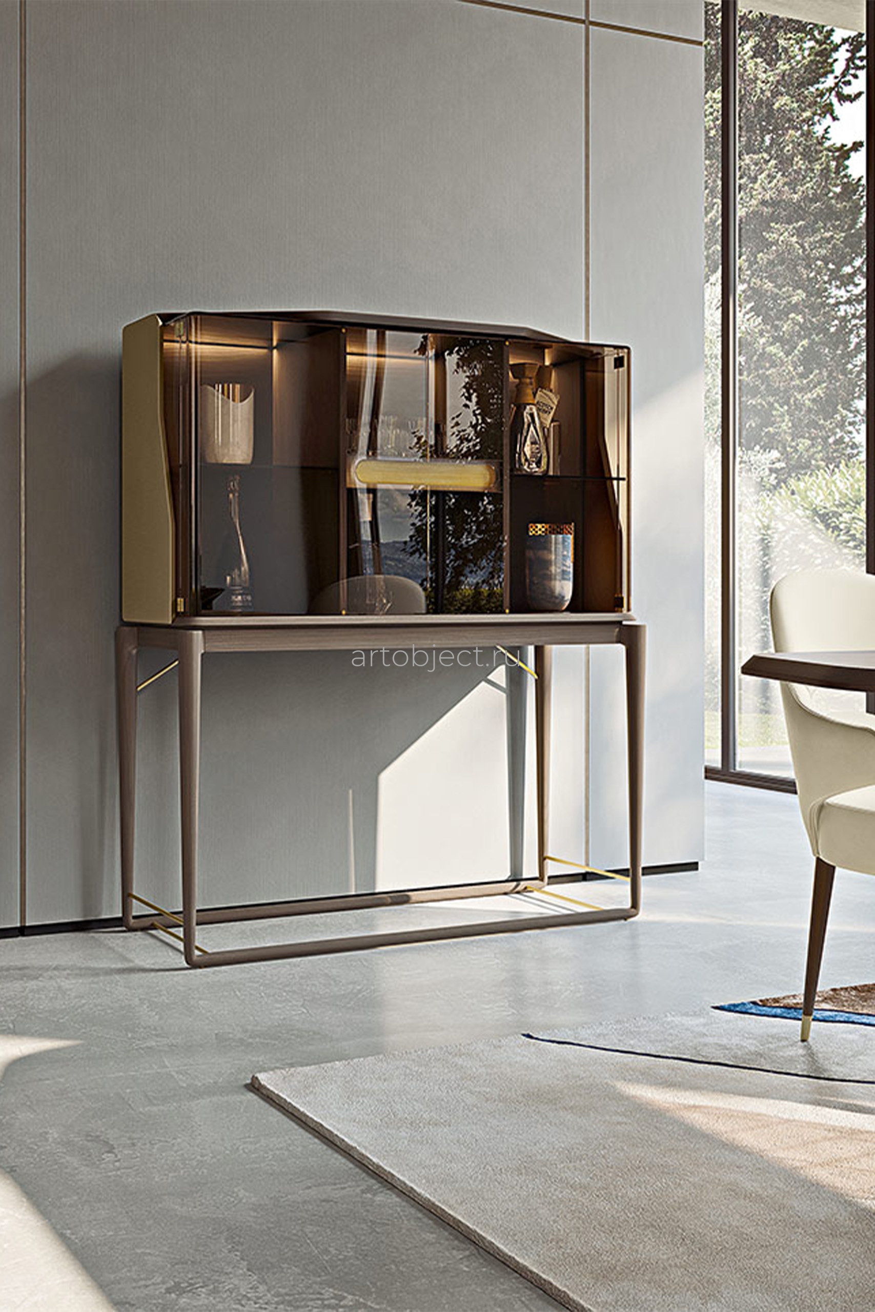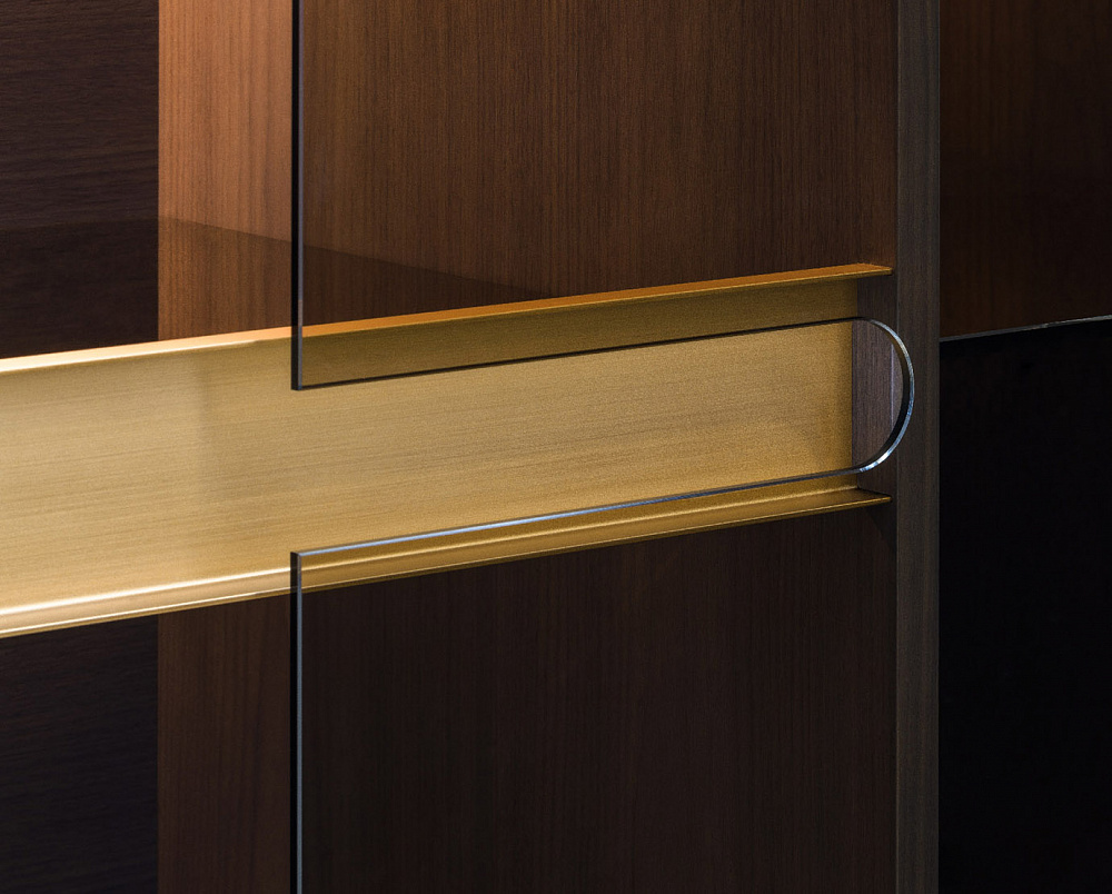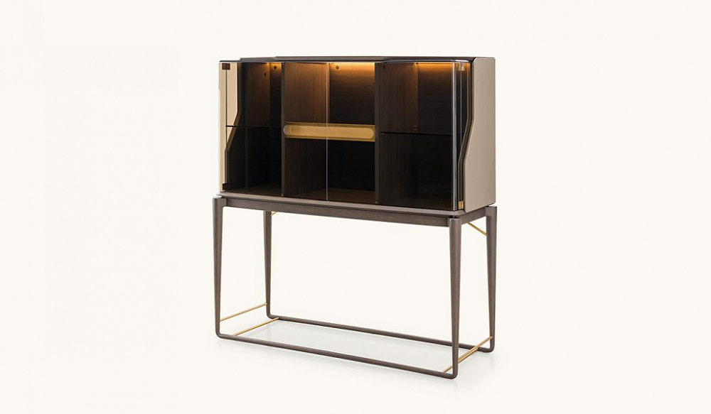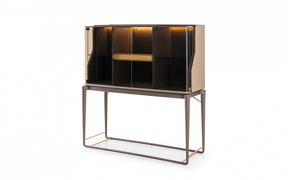 Каркас: МДФ, фанера, массив дерева и ДСП с ореховым шпоном. Отделка: кожа. / Двери: две из бронзированного стекла. / Детали: отделка металла под матовое золото или матовую бронзу.